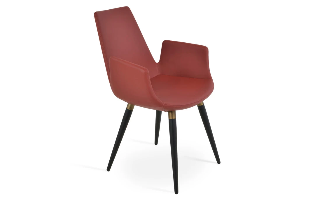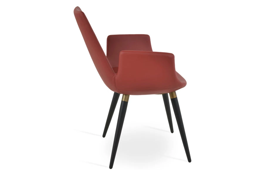 Eiffel Arm Ana is a contemporary chair with a comfortable upholstered seat and backrest on steel legs available in black powder with gold bracelets and footrest and walnut veneer with stainless steel brushed bracelets and footrest. The seat has a steel structure with “S” shape springs for extra flexibility and strength. This steel frame is molded by injecting polyurethane foam. Eiffel seat is upholstered with a removable velcro, enclosed leather, PPM, leatherette, wool as well as Camira organic wool slip cover that can be changed with professional help. Eiffel Arm Ana may be upholstered with variety of other colors as a special order with a minimum of quantity required. The chair is suitable for both residential and commercial use. Eiffel Arm Ana is designed by the sohoConcept team.