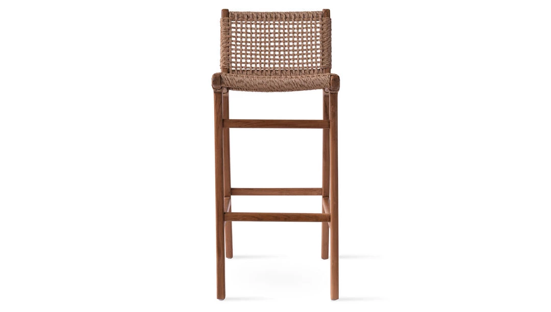 Synthetic rope knitted stool on teak frame. It is a product that can be easily used outdoors, and will make a difference with its stylish and modern appearance. The stool with Scandinavian retro design gives this club stool a very distinct looks that are almost impossible to match. Crafted using Indonesian grade A teak wood and Viro fiber wicker that is highly durable in any temperatures. Appropriate for heavy commercial use, these grade A teak stools are constructed of large teak timbers with sturdy mortise and tenon joinery.Paramus Teak Stool is a perfect design solution for both residential and commercial use.
