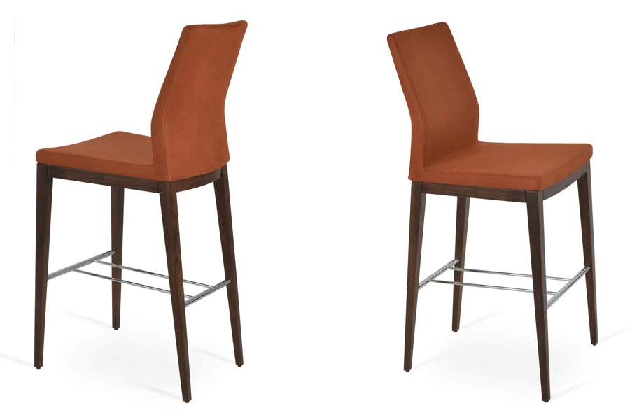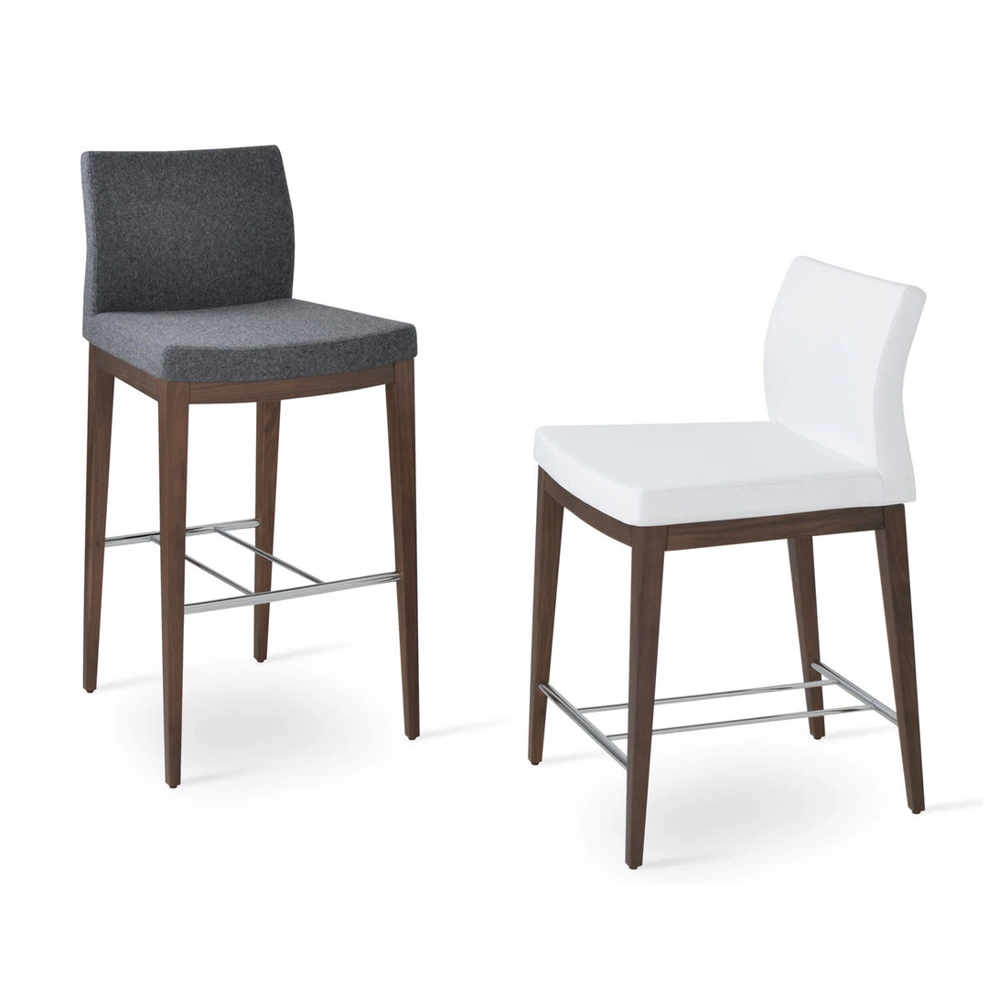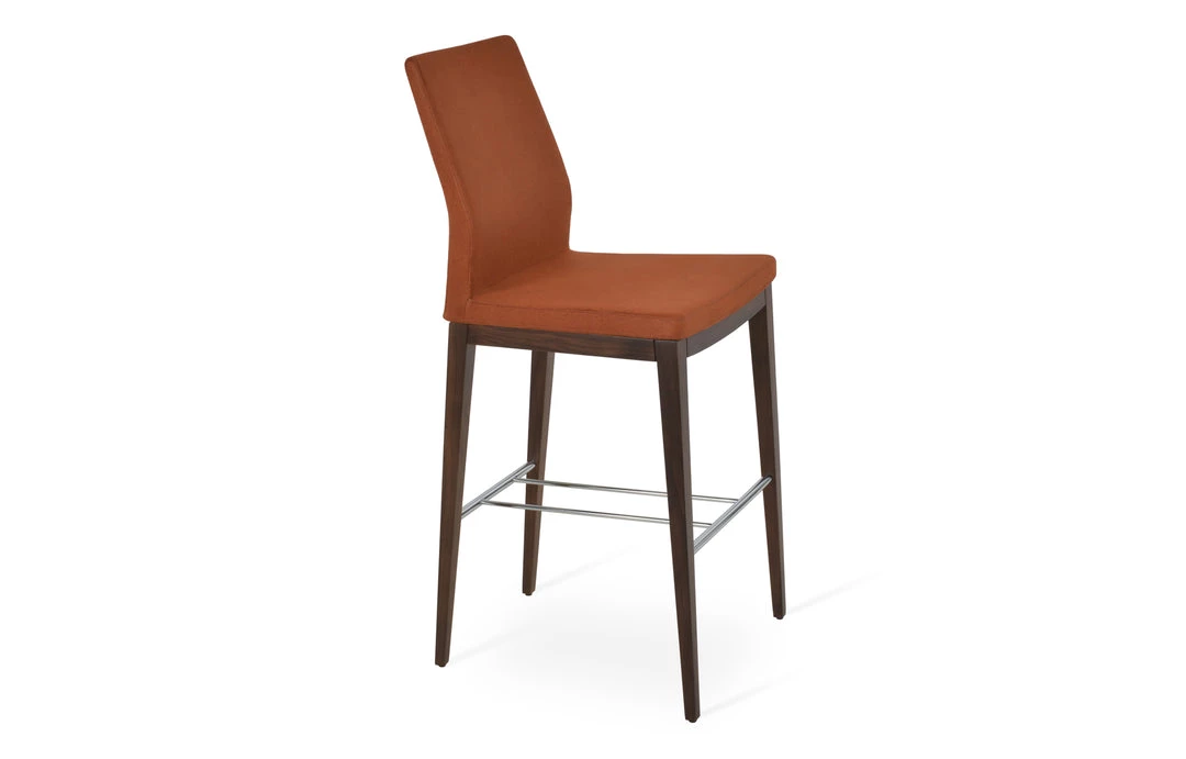 Pasha Wood Stools is an ergonomic bar and counter stool with a comfortable upholstered seat and backrest on solid beech legs tipped with screwed plastic caps. With its chromed steel footrests, it is an ideal stool for bars and counters. The seat has a steel structure with “S” shape springs for extra flexibility and strength. This steel frame is molded by injecting polyurethane foam. Pasha seat is upholstered with a removable velcro enclosed leather, PPM or wool fabric slip cover. The stool is suitable for both residential and commercial use. Pasha Wood Stools is designed by Tayfur Ozkaynak.
