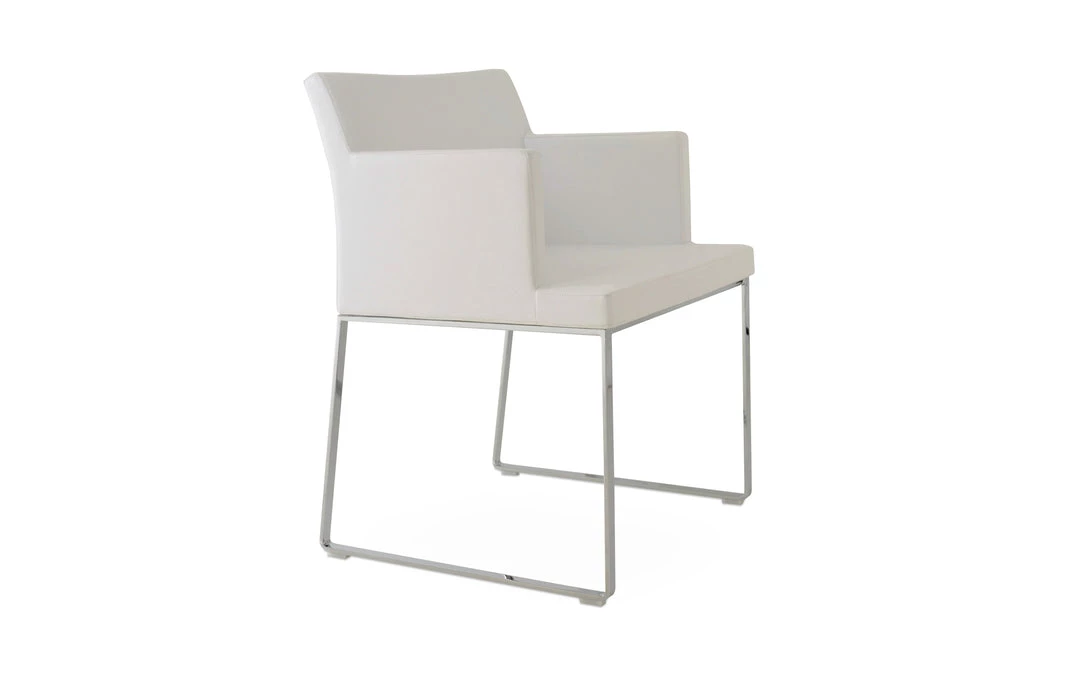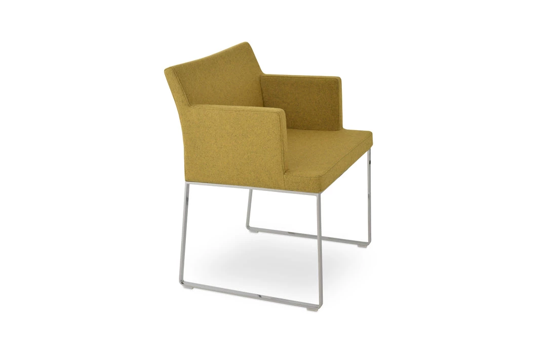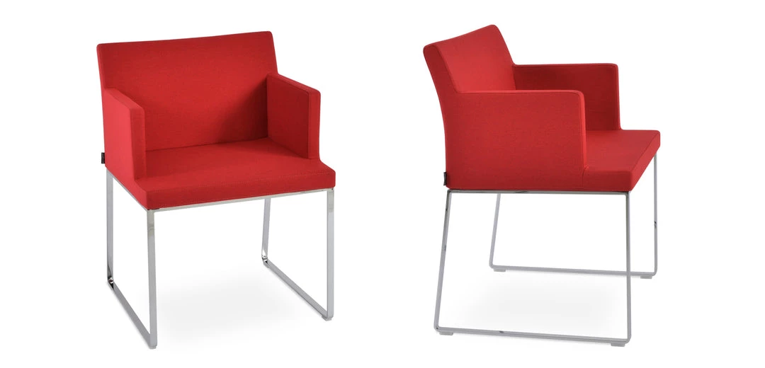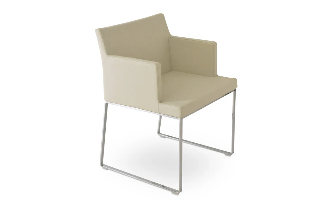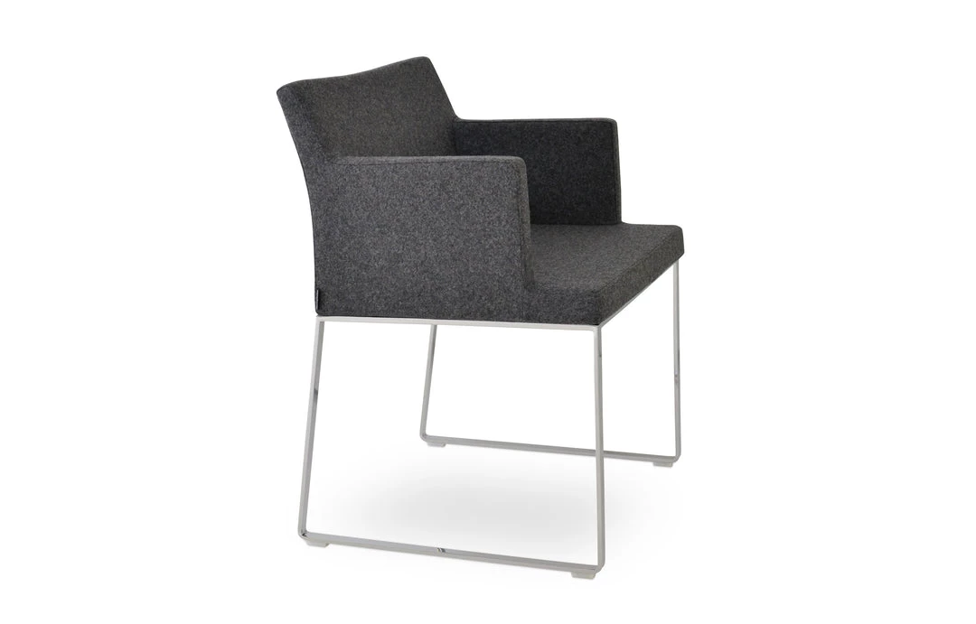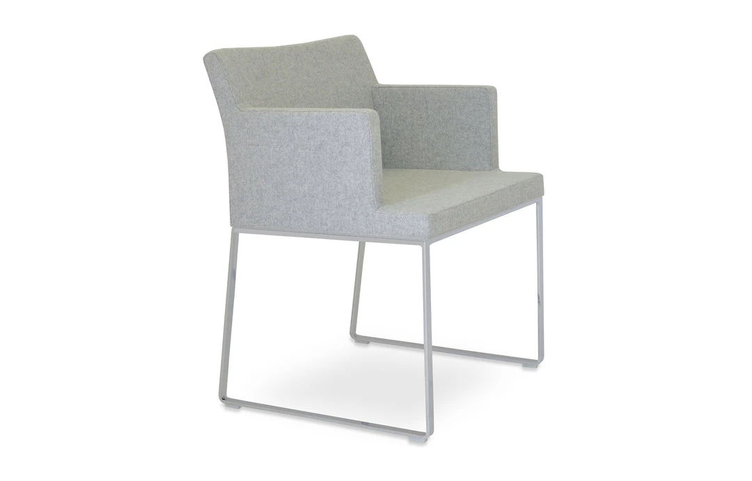 Soho Sled Arm Chair is a classy armchair with a comfortable upholstered seat and backrest on chrome steel sled base. The steel base can be finished in black powder coating. The seat has a steel structure with “S” shape springs for extra flexibility and strength. This steel frame molded by injecting polyurethane foam. Soho seat is upholstered with a removable velcro enclosed leather, PPM or wool fabric slip cover. The chair is suitable for both residential and commercial use. Soho Sled is designed by Tayfur Ozkaynak.