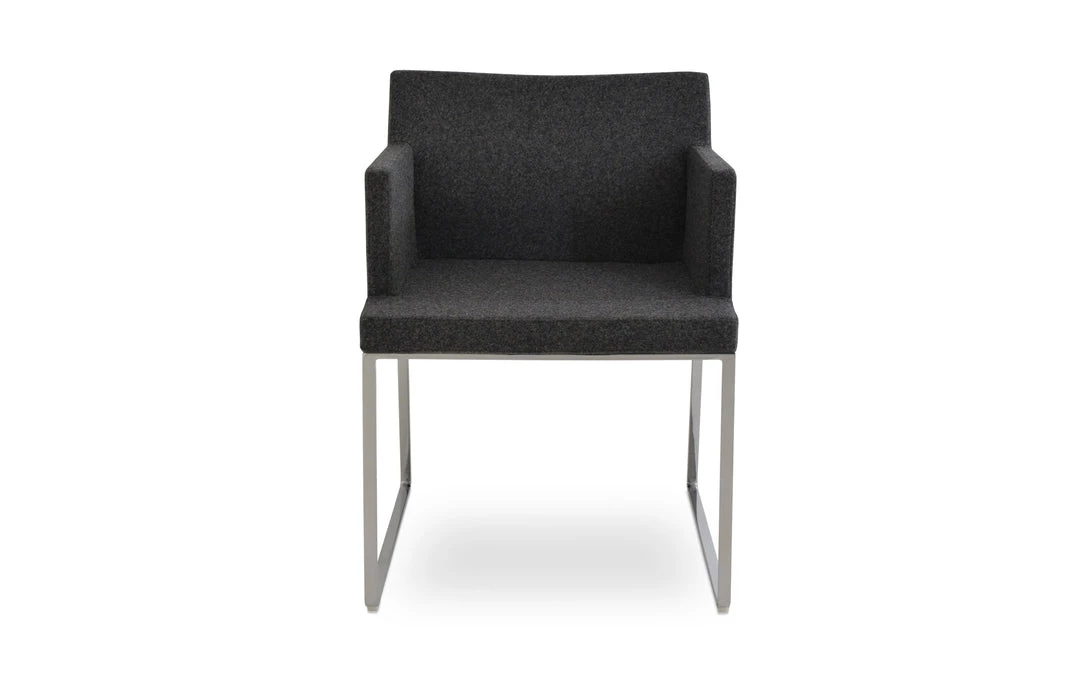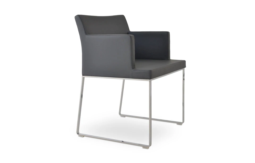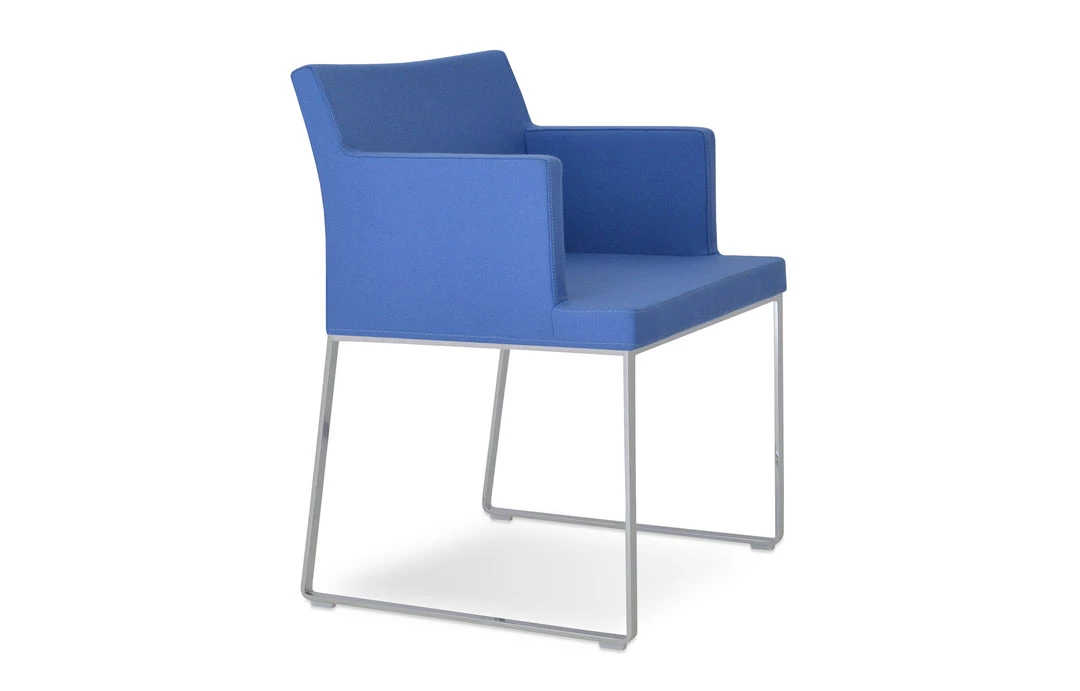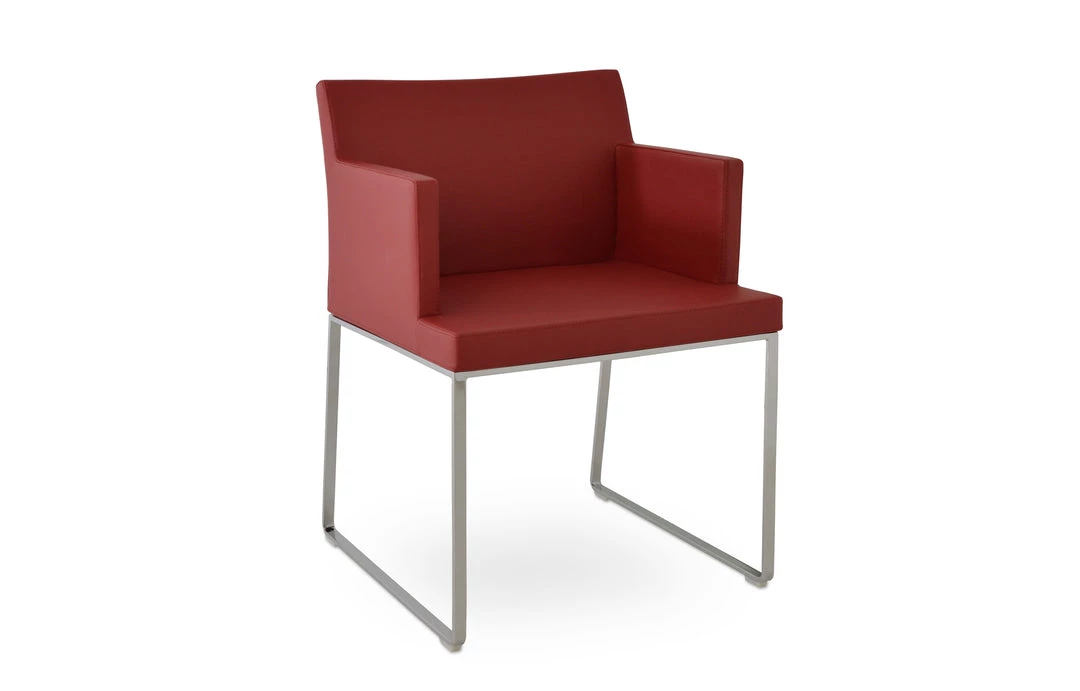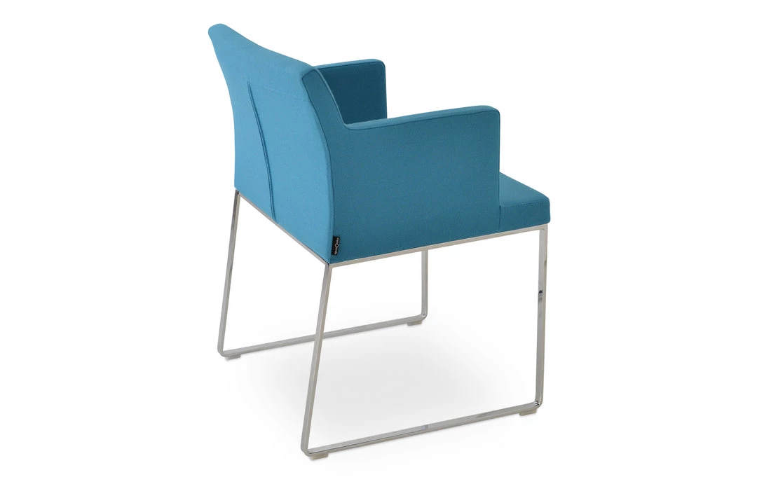 Soho Sled Arm Chair is a classy armchair with a comfortable upholstered seat and backrest on chrome steel sled base. The steel base can be finished in black powder coating. The seat has a steel structure with “S” shape springs for extra flexibility and strength. This steel frame molded by injecting polyurethane foam. Soho seat is upholstered with a removable velcro enclosed leather, PPM or wool fabric slip cover. The chair is suitable for both residential and commercial use. Soho Sled is designed by Tayfur Ozkaynak.