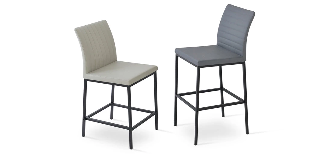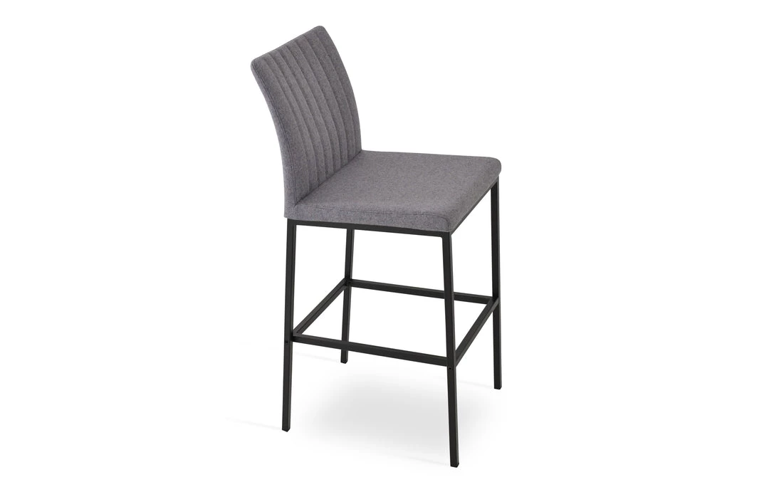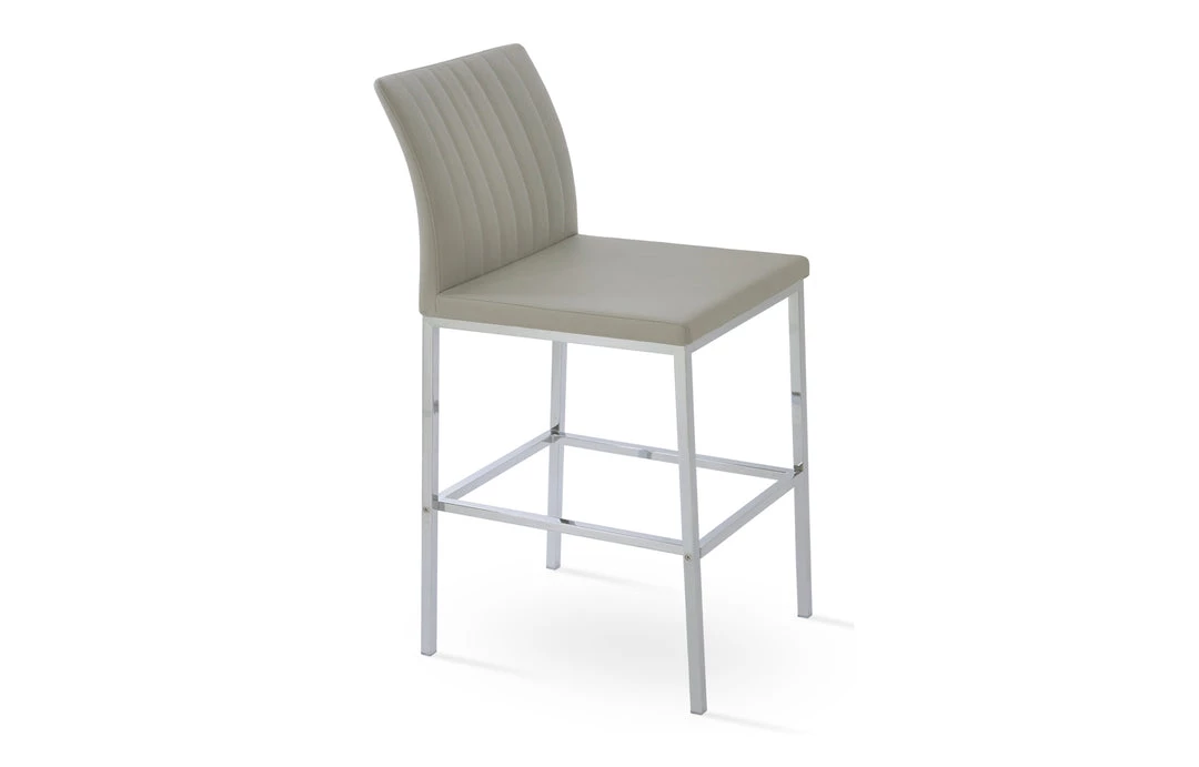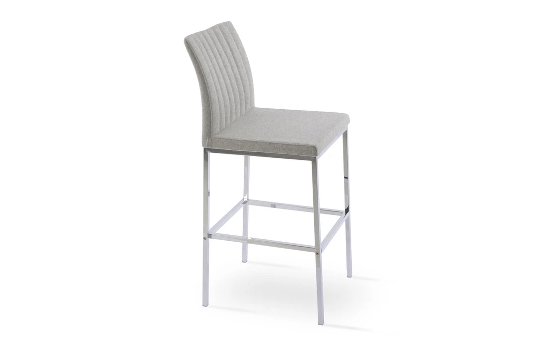 Zeyno Metal Stools is a contemporary counter and bar stool with a comfortable upholstered seat and backrest on chromed steel legs which are plastic tipped. With its chromed steel legs and footrests, it becomes an enduring style for bars and counters. The seat has a steel structure with “S” shape springs for extra flexibility and strength. This steel frame molded by injecting polyurethane foam. Zeyno seat is upholstered with a removable velcro enclosed fabric, leatherette, PPM, leather or wool fabric slip cover. The stool is suitable for both residential and commercial use. Zeyno Metal Stool is designed by Tayfur Ozkaynak.