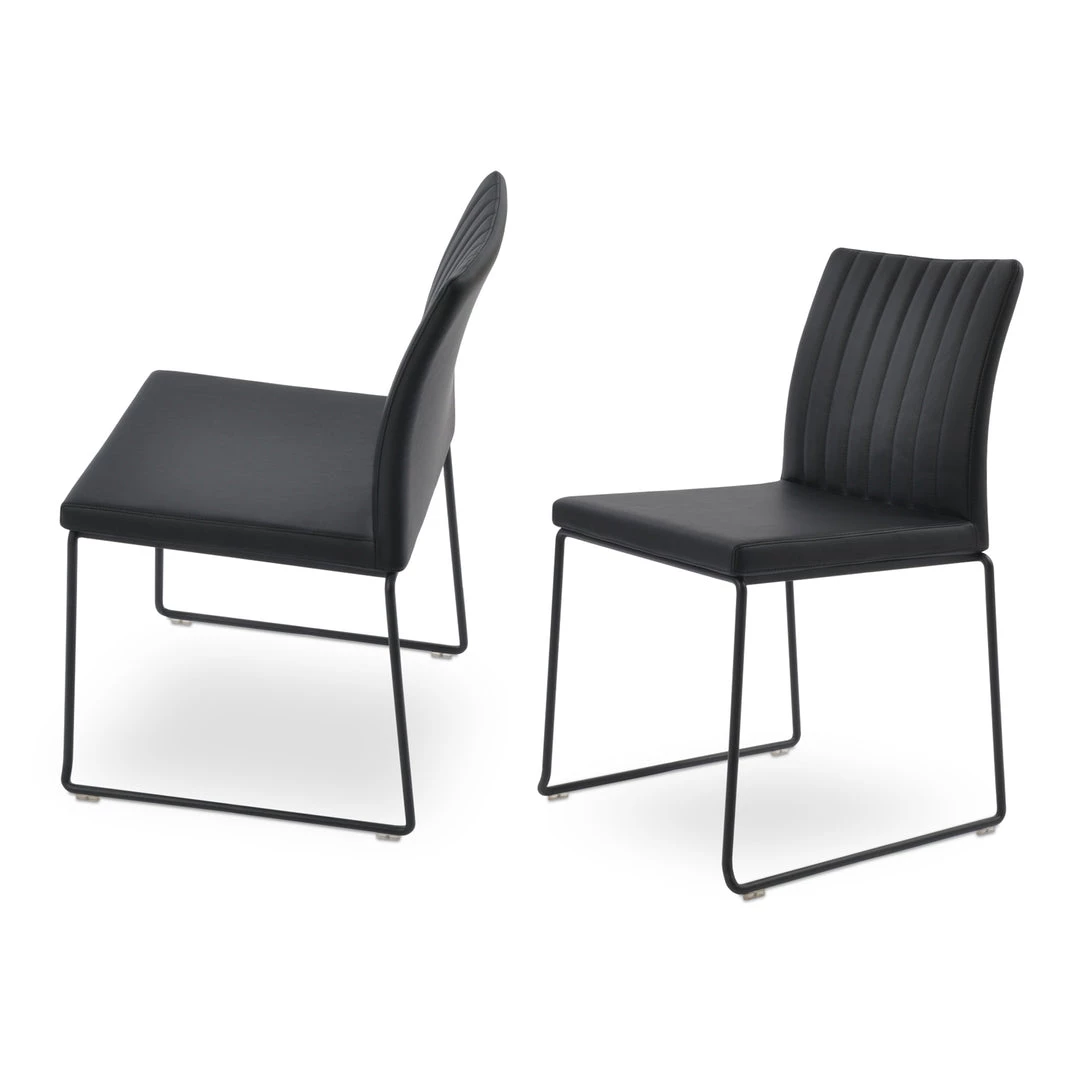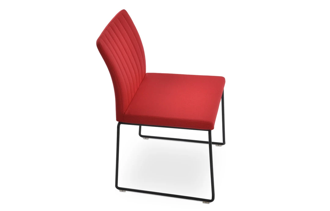 Zeyno Stackable is a contemporary dining chair with a comfortable upholstered seat and backrest on stainless steel stackable base. The steel base can be finished in black powder coating. The seat has a steel structure with “S” shape springs for extra flexibility and strength. This steel frame molded by injecting polyurethane foam. Zeyno Slede Chair seat is upholstered with a removable velcro enclosed fabric, leatherette, PPM, leather or wool fabric slip cover. Other colors are available as a special order with a minimum quantity required. The chair is suitable for both residential and commercial use. Zeyno Profile is designed by Tayfur Ozkaynak.