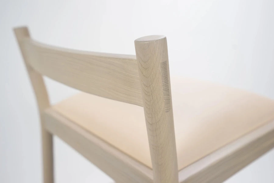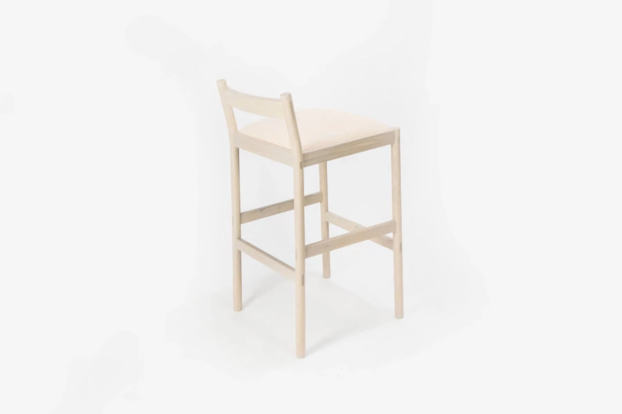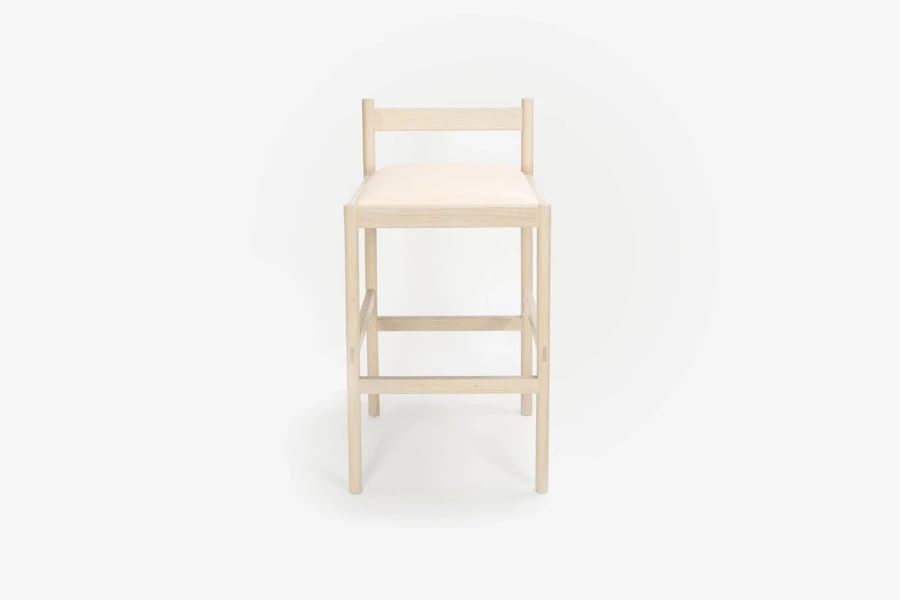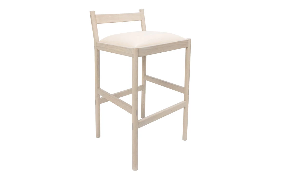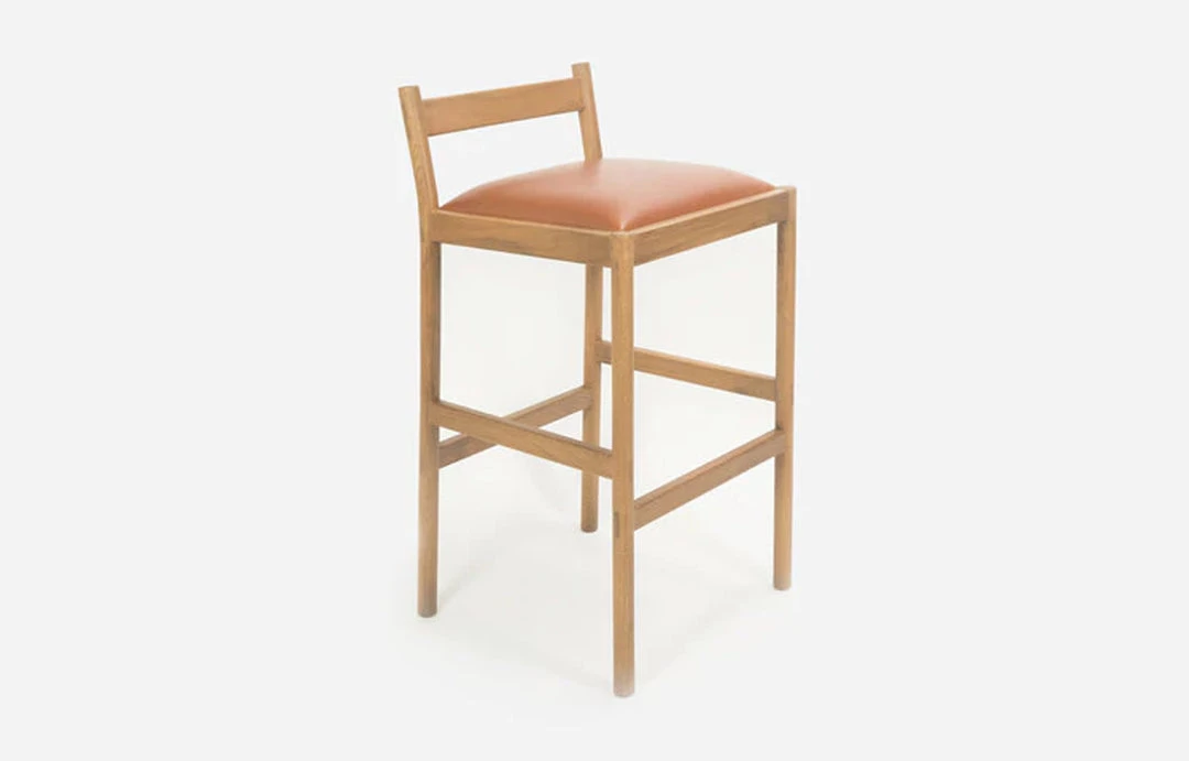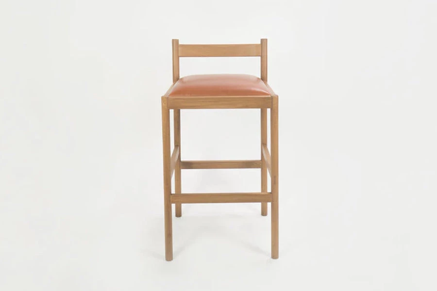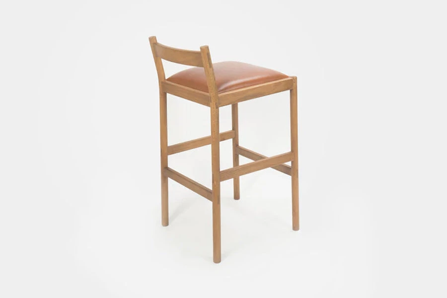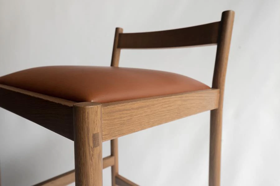 This minimal bar stool combines clean lines with quality material: solid white oak and vegetable tanned leather from a multi-generation family-run Italian tannery in Tuscany. Made using traditional joinery techniques with exposed tenons visible throughout. For the Carob stool, we designed around what we like in a stool – a wide, cushioned, comfortable seat, a practical footrest, and an easily moveable form from all angles in a crowded space. The stool was designed around minimizing its horizontal footprint, maximizing the available space at the bar.