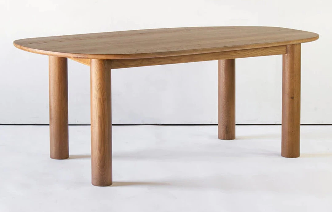 The Ohm dining table is a solid white oak dining table featuring an organic, asymmetric top. We’ve designed it with a little funk. If you’re looking to bring some fun flavor to the dining room, this one’s for you. Please note that we make each piece by hand, and every tree is different, so you’ll see slight variations in color and pattern. These aren’t machine made, and we use solid wood, not veneer or engineered wood.